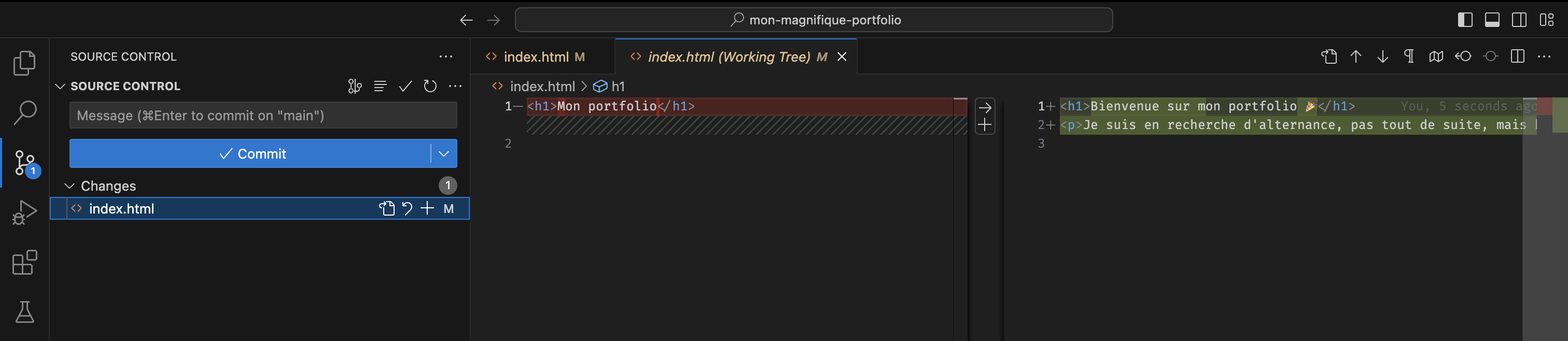 Maintenant, on va également changer le titre du portfolio mais depuis le repository local cette fois. Change le h1 puis git add, commit, push, comme tout à l'heure ! (Je te laisse retourner voir ce qu’on a fait plus haut pour faire ça ⬆️).